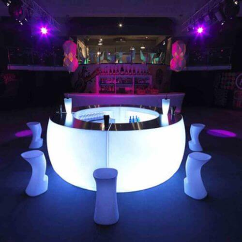 Decide if your bar is primarily a functional station or a decorative centrepiece. A bar like the Ice Round Bar can serve as both. Our stunning curved bar will light up any party or event. This bar can be illuminated in a range of colours using a remote control and four curved bar units can be combined to create a round bar.
