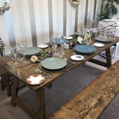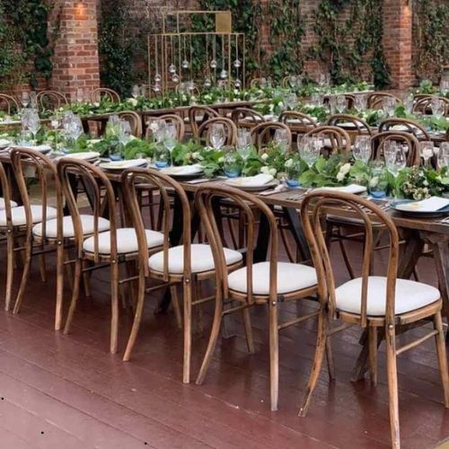 Our NEW Rustic Wedding Table is the star of the party. The table matches perfectly with our Bentwood Rustic Oak Chair (seen in picture), as well as our favourite Diamond Coloured Glassware. We recommend experimenting with some colours. Why not mix it up with coloured plates, some colourful napkins and gold cutlery!