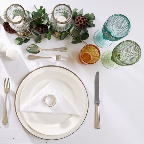 Paired with the Rustic Wedding Table and Oak Chair, these coloured glasses brighten up the table! There Diamond Goblet shape make them a unique addition to any dining table. We offer four different styles that are available to hire, Green Diamond Wine Goblet, Blue Diamond Wine Goblet, Green Diamond Water Glass and a Clear Diamond Water Glass.