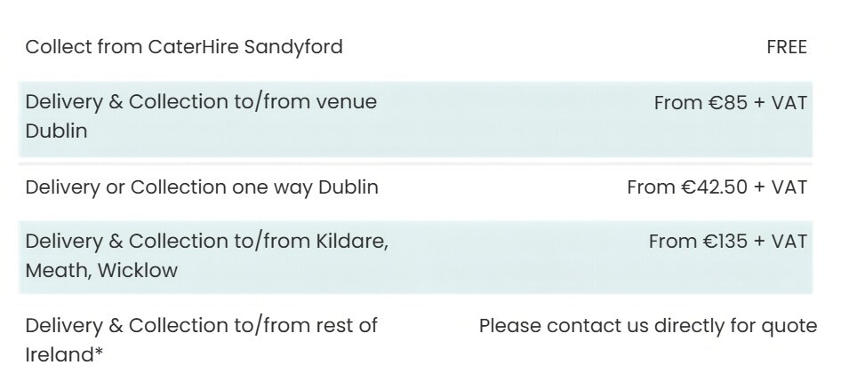 Delivery and collection charges in the Dublin area start from €80 (ex VAT) for orders booked online. This rate is based on a one van delivery during normal business hours. For orders booked directly with the customer service team the price will be determined by the order size and the number of vehicles required to deliver the order. For destinations outside of Dublin deliveries are calculated on a cost per km basis. For further information please call our customer service team on 01 294 3111