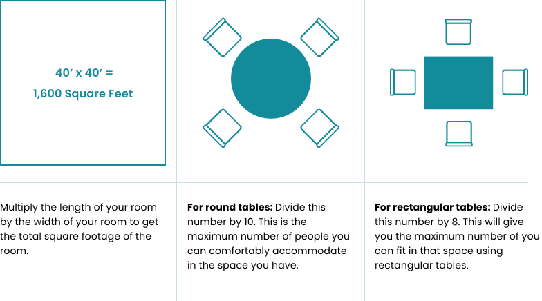 The ultimate room layout will have a large impact on the number of people you can accommodate however a good indication can be achieved by following the below simple rules.